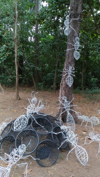 走進漁光島海邊的木麻黃林中,一群用鐵絲纏繞編成的白色螞蟻出現眼前。牠們或攀附在黑色菜簍搭構如土堆的隆起物上,或已捷足先登爬上樹幹。