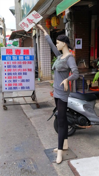 我原本優雅自信地站在服飾店的櫥窗裡,店主人隨季節更迭,經常為我替換流行華服。無奈服飾店結束營業,我輾轉來到了這家麵店,老闆發揮創意巧思,讓我如自由女神般舉起這塊招牌。