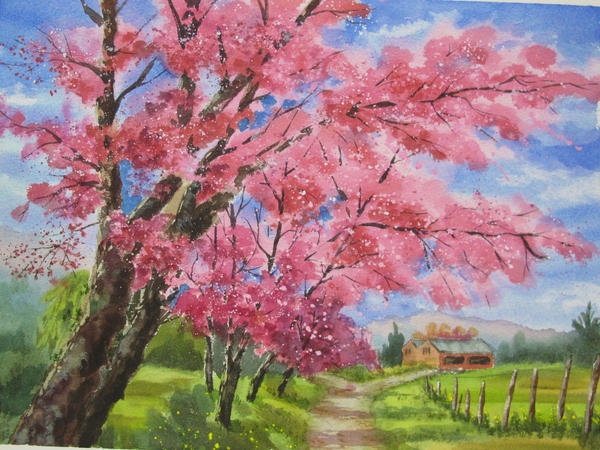 我一眼即看出畫作的問題所在---櫻花樹景深表現不足。但畫技不佳的我也不敢再繼續修改,深怕越畫越髒,這可是水彩畫最忌諱的。希望有機會能獲得老師或前輩指導。