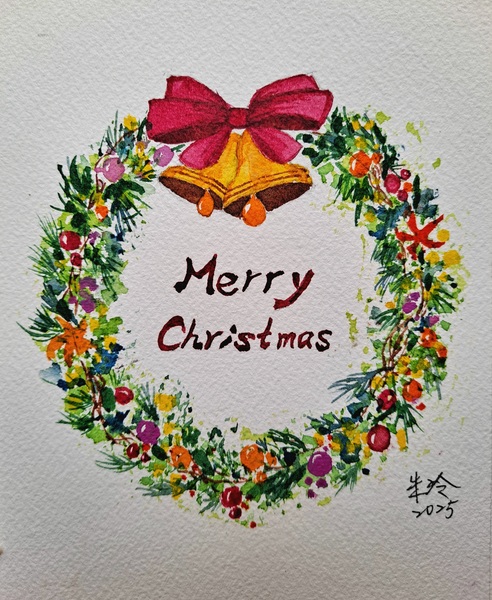 這幾年,每年都要手繪一張聖誕卡 前兩年畫的是聖誕樹 今年來點不一樣的 就畫一張聖誕花圈吧 (心裡構圖好即隨興地畫,未講究細節)