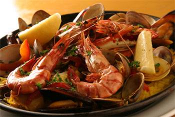 西班牙菜以海鮮聞名,其中以西班牙海鮮飯Paella及Tapas最具代表性。西班牙海鮮飯可以說是西班牙料理的代表,沒有吃過海鮮飯,就等於沒吃過西班牙料理。海鮮飯的料理方式是在傳統的Paella鐵鍋中,翻炒海鮮及其他配料(雞肉、蔬菜...等),加入生米及番紅花一起悶煮,等全部煮好後,香噴噴的海鮮飯就完成了。而Tapas為西班牙文「小菜」的意思,發源於百年前的安達魯西亞-這裡同時也是西班牙代表酒類雪莉酒sherry的故鄉。據傳盛產水果的安達魯西亞區有許多的果蠅,為避免喝酒時果蠅掉進杯子裡,當地人就發明了一種方式,將配酒的小菜放在小碟子上,再將小碟子放在杯口,這樣果蠅就不會掉進去了。久而久之這就成了西班牙的特色,大家都習慣在吃飯前吃一些可口下酒的開味小菜。