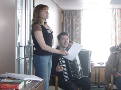 上完俄文課,緊接著上Olga的俄文歌課程,萬能的樂師Andrey拿著手風琴幫我們伴奏。酷酷的Olga長得非常像茱莉亞羅勃茲Julia Roberts,我們問她是否有人這麼問過她,她很驕傲的說:「應該是她像我吧!」。我們學的第一首俄文歌是一首傳統俄國民謠「Kalinka」,這首民謠就是「俄羅斯方塊」的背景音樂,我們對這首旋律非常耳熟能詳,因為發音比較簡單,加上英文拼音的輔助,一下子大家都琅琅上口。不過後面幾首歌就沒這麼幸運了,所有人都舌頭打結,Olga不可置信說:「這麼難嗎?這是俄國小朋友唱的呢!」結果所有人都苦著臉跟她說:「難!非常難!」