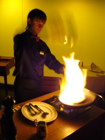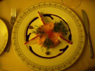 我們趁著上菜前的空檔,跑到走廊去參觀,順便也看一下別的包廂,饒富樂趣。 至於食物的口味,表現的還算名符其實。我們點了一些俄國傳統有名的菜,如俄式肉凍,基輔炸雞,香料烤雞,魚子醬牛排,烤小羊排,煎鱒魚。。等等,口味都還不錯。不過,其中有一道蘑菇湯,就令人不太敢恭維,因為用料十足,蘑菇湯的稠度已經到了"濃的化不開"的地步,所以喝了幾口,宣告放棄。這算是這次吃到比較不習慣的菜色。