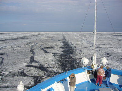 奧涅加湖的緯度超過北緯60度,冬天非常長,從11月底到4月底,全年冰封期達209天。每年的11底開始,從湖岸邊開始結冰,大約到1月中整個湖泊會呈現冰封狀態..這幾年全球暖化現象明顯,有時湖中央並不會結冰。不過今年的天氣偏冷,所以我們5月初去的時候,連剛進湖的地方都還有大片浮冰,使得我們無法去到基日。