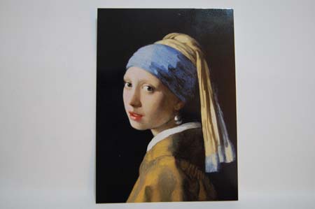 走進二樓右側的一間房間,牆上的中間就掛著「戴珍珠耳環的少女」,畫作本身大概只比 A4稍微大一點。我靜靜的站在她的前面,細細的觀賞著每一處細節 ; 這幅畫的筆觸是如此的細膩,美麗溫柔的年輕女僕神情天真的回眸望著,她的目光如水,她的紅唇微張,她的珍珠耳環閃耀著光芒..這樣的情境,怎能讓畫家不愛上小女僕? 而可以畫出這樣動人的畫作,誰又能不愛上維米爾?