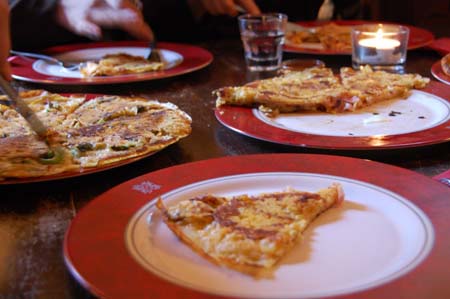 過了一會兒先上了三個傳統口味的 pancake,內餡分別為番茄洋蔥蘑菇, salami 起士,以及綜合口味。我們的食後心得,都認為其實這個 pancake 跟 pizza 頗為類似,基本上跟蔥油餅的相似度也很高,口感也很跟早餐店的蛋餅雷同,所以應該追本溯源,都是系出中國的蔥油餅家族。