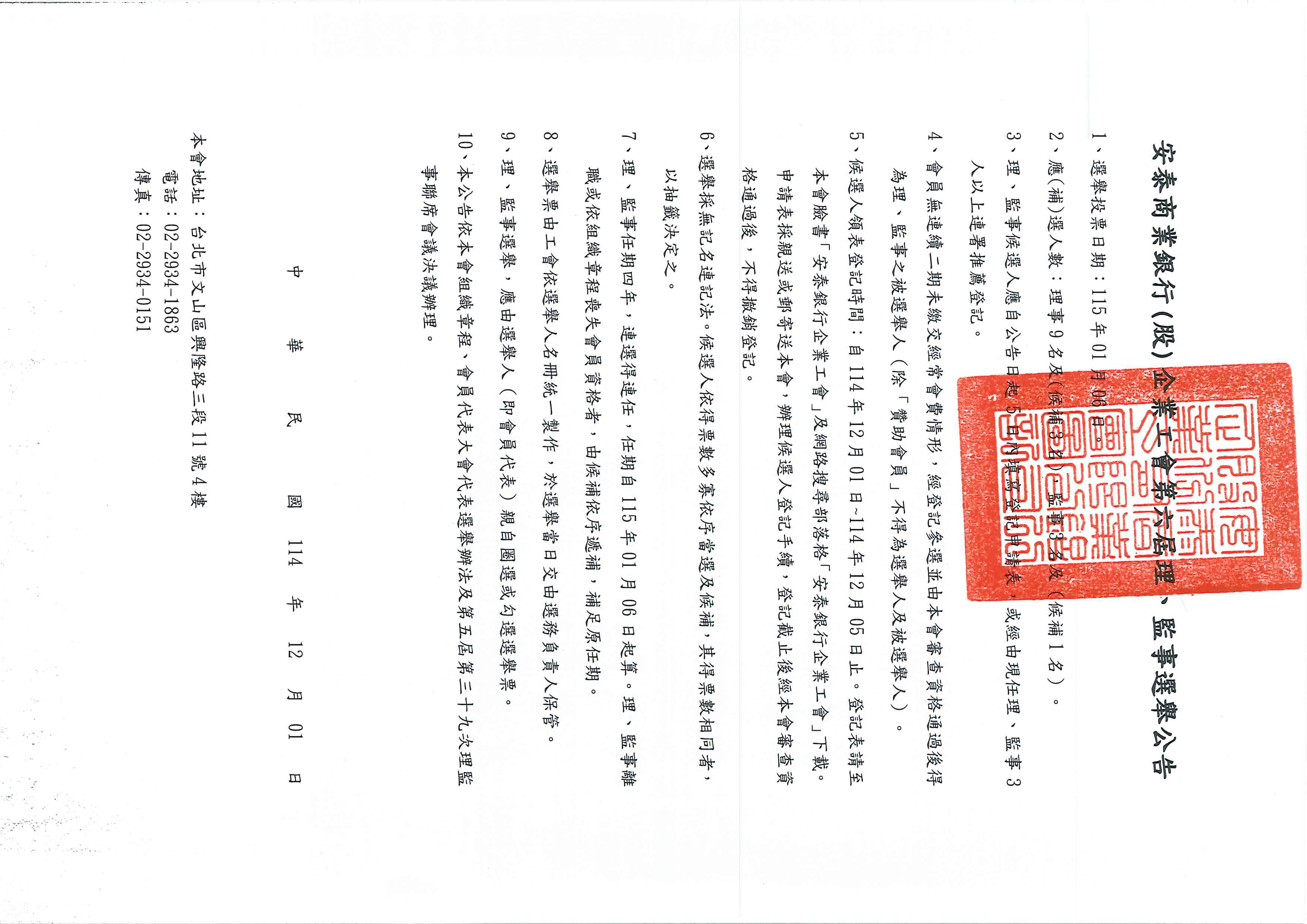 安泰商業銀行(股)企業工會第五屆理、監事選舉公告