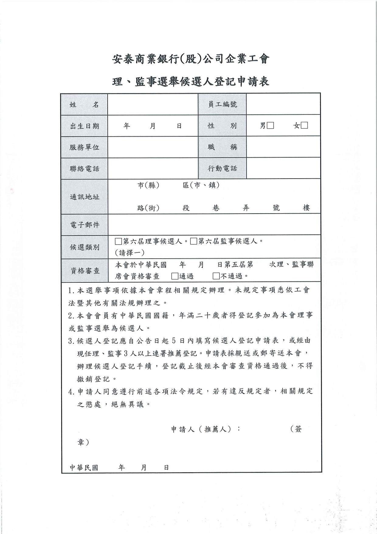 安泰銀行企業工會第六屆理監事選舉登記申請表