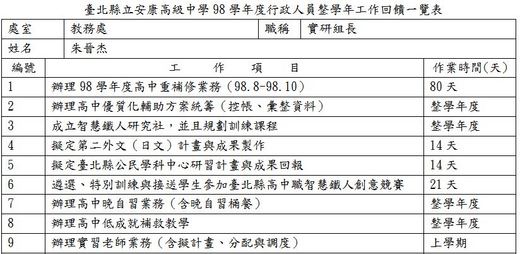 範本:臺北縣立安康高級中學98學年度行政人員整學年工作回饋一覽表.doc