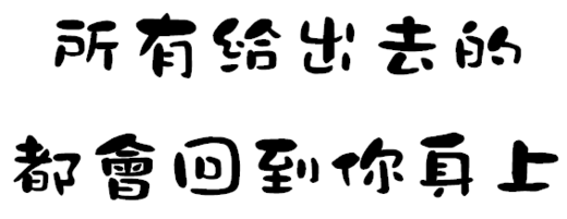 這幾天我一直用這句話:「所有給出去的,都會回到你身上」來檢視自己,我們是否應該多一點點關懷在別人身上,別人才會關懷你,我們是否應該多幫別人一點點,別人才會幫你,我們是否應該勇於付出,這樣子別人才會付出給你,或許有些時候,這些回報沒辦法像作用力與反作用力一般如此即時,但相信它們終會回來的!