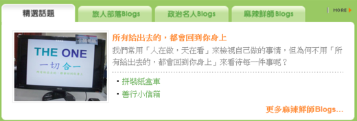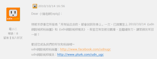 在這網路社群成長快速的年代中,我們更要善加利用這樣子的想法,以部落格為例,你看這麼多推薦數很高、回應數很多的部落格,哪一個部落格格主不是也用適時地肯定他人、回應他人來獲取這樣子的人氣及成長。
