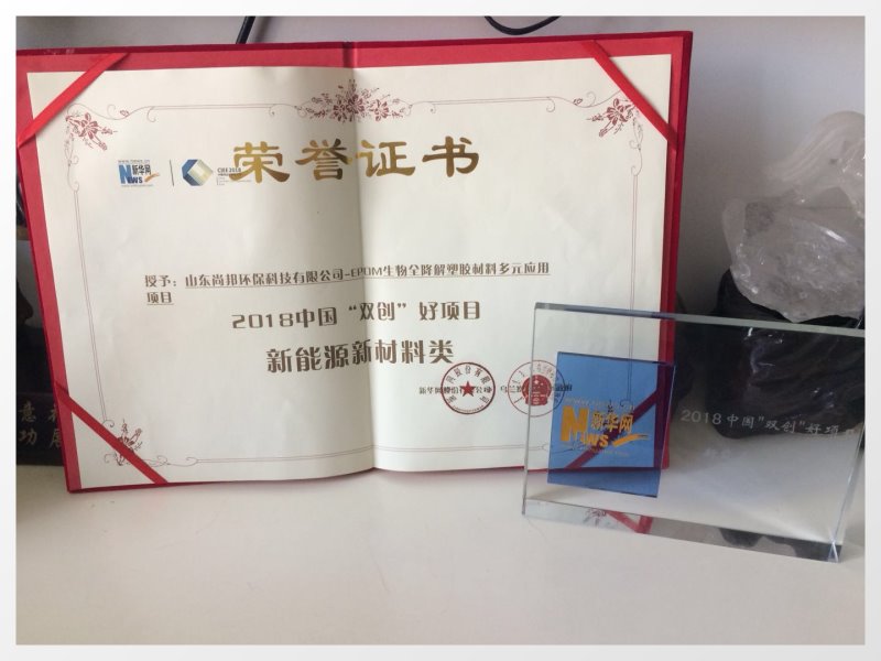 獲得中國創業創新博覽會:新能源新材料領域獎-材料名稱: EPOM生物分解環保塑膠