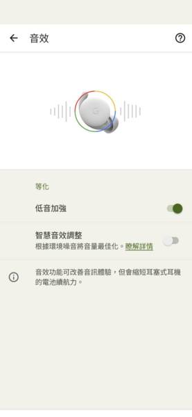 音效設定點入後,可設定低音加強,低音有明顯改善加強。至於智慧音效調整,看網路上的開箱測試,會根據環境音改變音量,環境音越大時,耳機聲音越大(大到一個極致也不好),所以我預設沒有開啟。