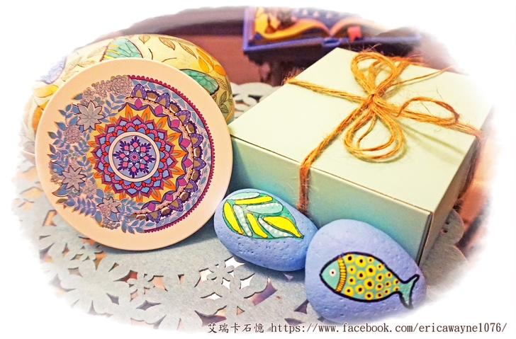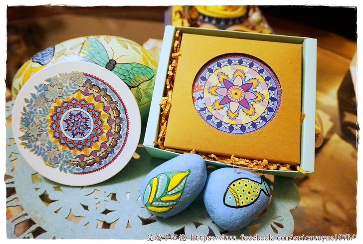 我手繪的曼陀羅圖案,印製了幾款不同的曼陀羅杯墊,朋友很開心收下,很喜愛這種富療癒系的圖案。