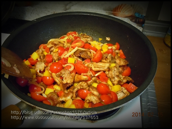 肌里肌切片,用鹽與胡椒醃十分鐘,鍋熱將肉下鍋煎熟,放入洋蔥絲拌炒出香味,再下小番茄,紅椒,黃椒,拌炒加入調味醬,拌炒好盛盤。