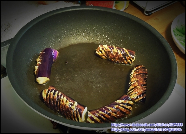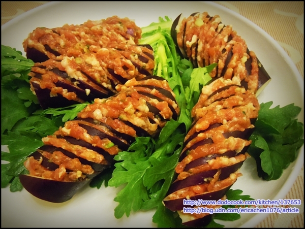 將豬絞肉用醬油與酒醃好,將茄子斜切不要切斷,將絞肉夾入。