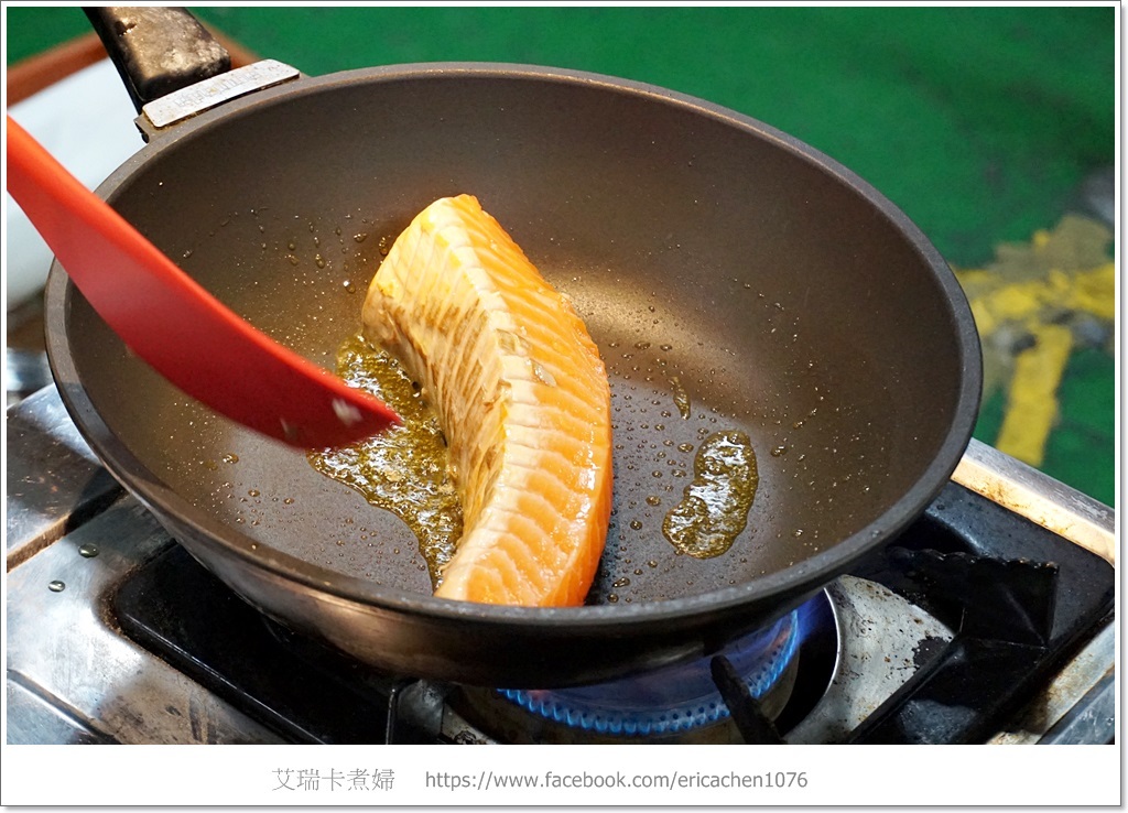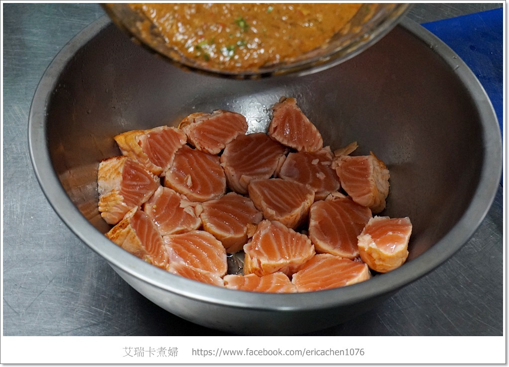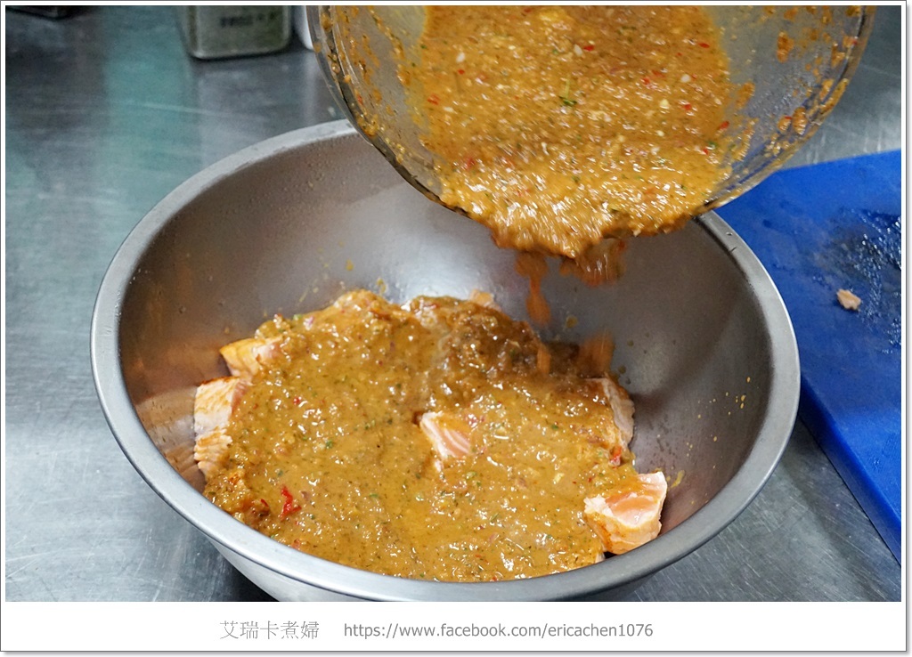鮭魚只要稍煎上色,放入打好的香料辣醬,置入冰箱,醃漬至少三十分鐘。