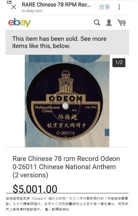這張由德國高亭(Odeon)唱片公司在一九三○年代戰前發行的「中國國民黨黨歌」七十八轉黑膠唱片,在拍賣網站上以五千零一美元售出,成為世界上最高價的國歌唱片。