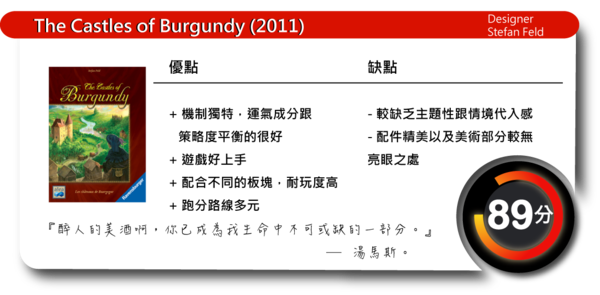 勃根地城堡是知名設計師Stefan Feld的成名作,甫一推出就衝入世界前二十大桌遊之林。獨特的機制以及好上手的規則,讓他在玩家的心中是邁入策略遊戲的優秀橋梁。若是想要進入策略遊戲的世界,勃根地可是許多玩家推薦的第一款策略遊戲喔,快來試試看吧!!