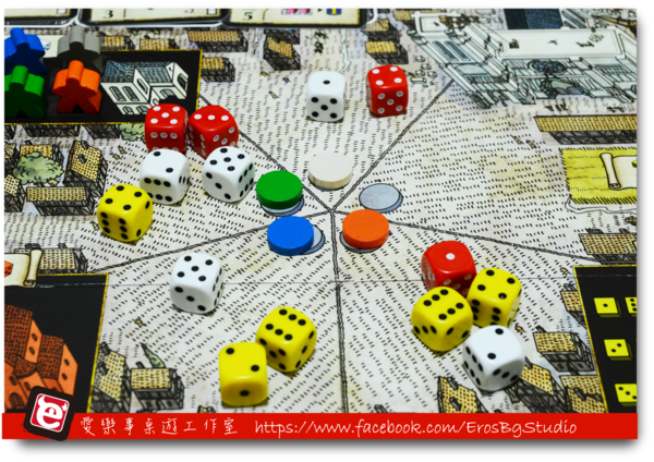 遊戲中,回合玩家們都會依照各階級的信任程度,拿取不同數量的骰子。丟骰以後,就開始進行最刺激的部分啦~~場上都有不同能力的任務卡,需要擺上特定點數或是數量的骰子,來獲取卡片的特殊能力以及分數。玩家們除了用自己的骰子以外,也可以強行的把其他玩家的骰子給買走喔~~到底該優先完成什麼任務,該把誰的骰子買走,這就是遊戲有趣的地方了。