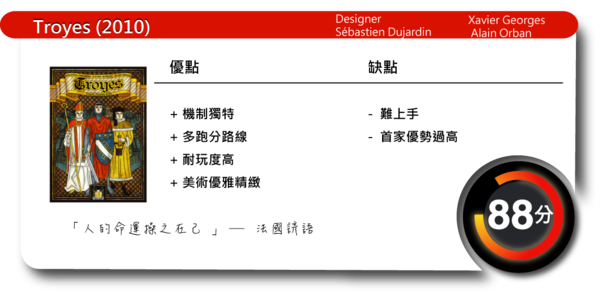 雖然說特魯瓦城是個以骰子為主軸的遊戲,但她卻一點都不運氣。能讓玩家盡情的享受思考與策略的樂趣,用各種的方式來改變自己的命運。畢竟,命運是操之在己啊。這款優雅又饒富策略的遊戲,錯過實在是太可惜了,快跟朋友們一起體驗一下吧!!