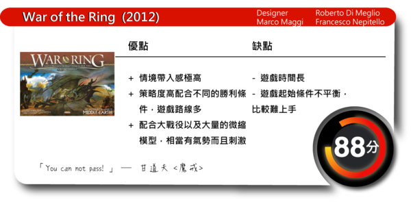 魔戒可以說是奇幻小說在這世界上的濫觴,而魔戒聖戰,更是魔戒主題桌遊中,排名最高也最讓人歎為觀止的一款作品。每次光是把這遊戲擺設出來,就有一種千軍萬馬的豪情。不只是玩家,旁觀的朋友也可以一同感受到這遊戲的氣勢!!