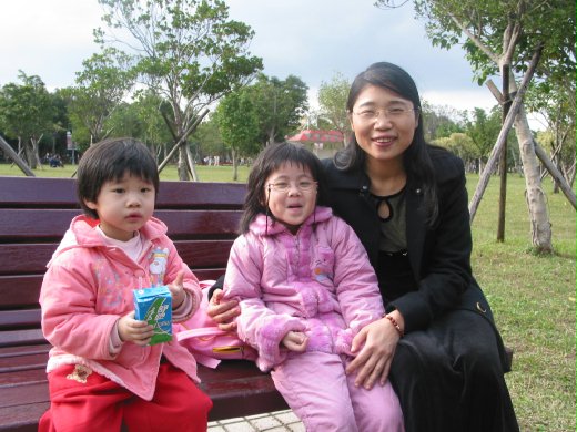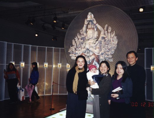 圖三:2000年12月30日,媽媽流連琉璃工坊菩薩系列作品,第三次背著音音去看,巧遇張毅、楊惠姍,張毅親切地破格開放非攝影區與我們合影,音音名自取自普門品,與千手千眼菩薩合影,別具意義。