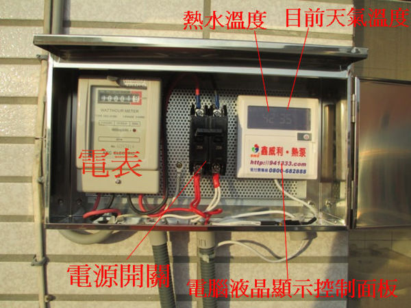 熱泵的專業電控系統,可以顯示天氣溫度和熱水溫度,讓客戶觀察天氣溫度和熱泵COP值的關係。以本案而言,當天的天氣溫度35度,COP=8,也就是(相對於電熱水器)省電8倍。