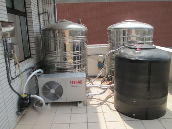 我們為陳先生設計2噸熱泵搭配1噸的保溫桶,為了冬天寒流時水龍頭一開就有熱水,陳先生還加裝了迴水系統。為了讓陳先生知道這套熱泵熱水系統的耗電量,我們也加裝了電表。陳先生沒有加收房客的熱水費用,所以三樓是滿租的,但是熱水的電費越少、陳先生才划算,有了熱泵專用的電表,陳先生就知道製造熱水的成本了。