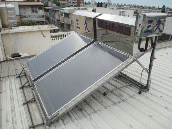張家屋頂原來的太陽能熱水器,經過改管路結合熱泵後成為泡湯熱水系統的一部份