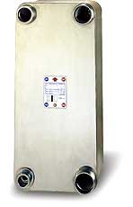 板式熱交換器係由沖壓成形之凹凸不鏽鋼板組成;其組立方式如下圖所示兩相鄰板片之山形凹凸紋路成180℃相反組合,因此兩板片之凹凸機脊線形成交錯之接觸點,待接觸點以真空銲接結合後,便構成板式熱交換器耐高壓之交錯槽道體系;此交錯的槽道系統便是使版式熱交換器之流體產生強烈紊流而達到高熱傳效果之原因。