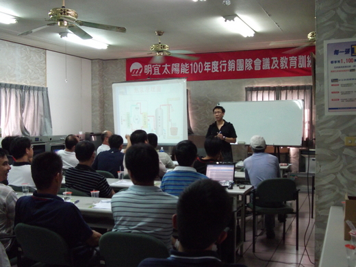 由於本公司目前是明宜太陽能的桃園地區經銷,明宜主要是以太陽能熱水器為主,對目前市場上熱門的熱水器商品「熱泵」並不熟悉,所以明宜太陽能特地請本公司專業技師劉先生到台中幫經銷商上課,讓經銷商可以更認識「熱泵」、以及將來要如何銷售「熱泵」產品。