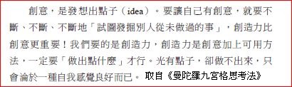 我們要的是創造力,創造力是創意加上可用方法,一定要「做出點什麼」才行。