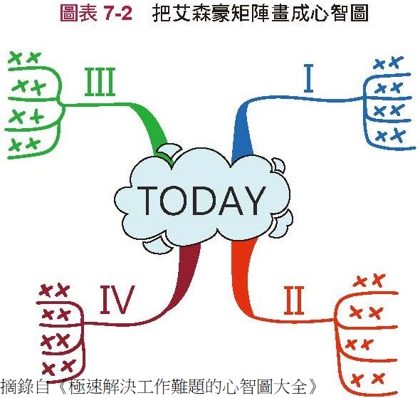 用心智圖製作今日的待辦清單時,會促進大腦不斷思考該將此事分類到哪一個象限中,同時也會讓四個象限中的數量一目了然,更容易看出導致時間不夠用的根本原因。(摘錄自《極速解決工作難題的心智圖大全》)