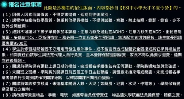 有幾個同業,每次都抄襲我們,這次是連【ESI 中小學天才冬夏令營】的宣傳文中關鍵字、報名注意事項也100%抄襲。