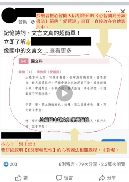 這次抄襲者的臉書廣告,把心智圖天后胡雅茹的《心智圖高分讀書法》書中範例「愛蓮說」的書頁,直接放在宣傳影片中。