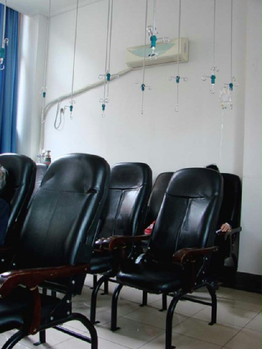 天花板上的滑道好幾排,掛著一個個點滴支架,下面的座位也是好幾排,這間注射室大概可以容納一百多人,針由手背插入,不用挽袖子,大家可以挑地方坐下,一邊看電視一邊打點滴…