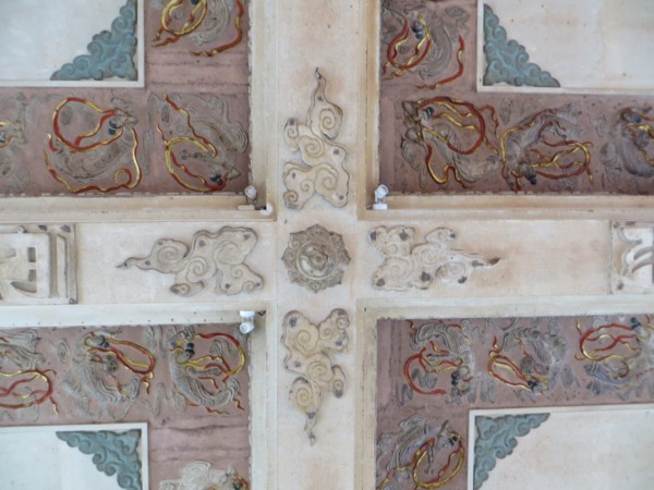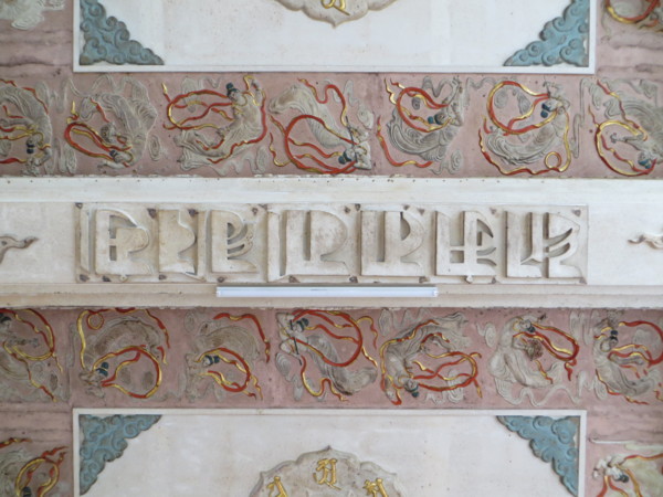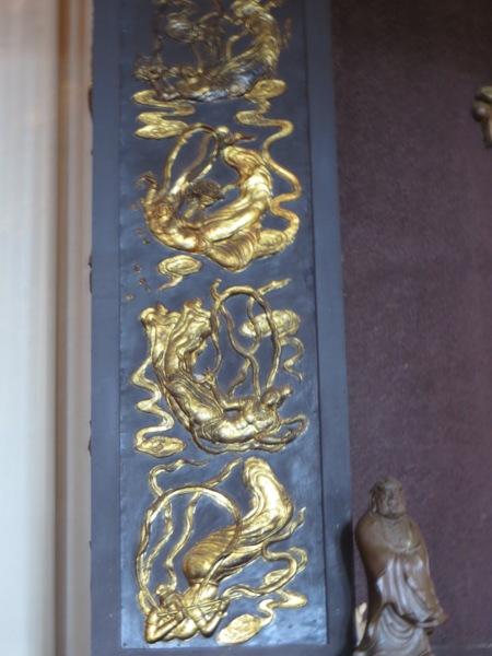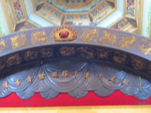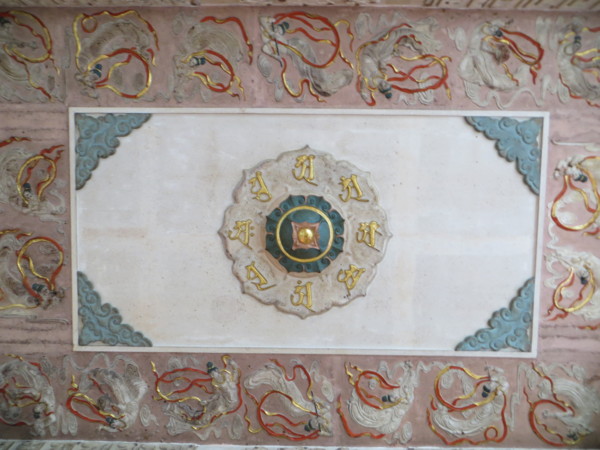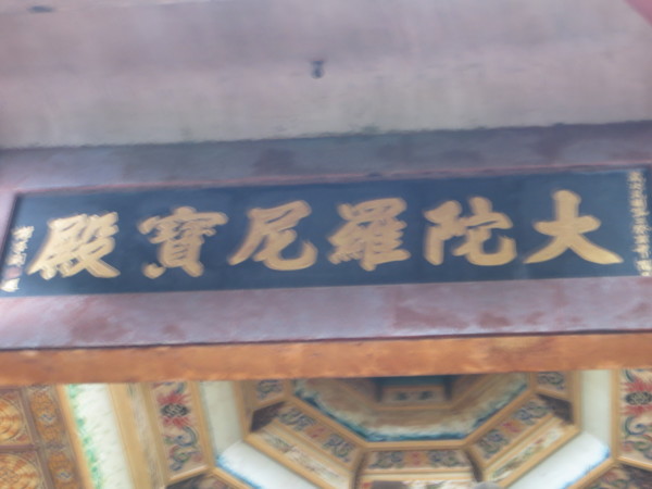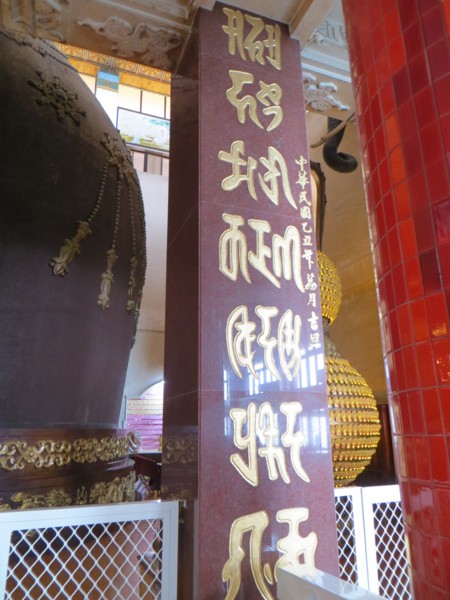 (大殿天花板全是一塊塊刻塑金色的梵文,文字端正,筆畫優美,但不知其深義,甚為遺憾,下次禮拜觀音時,再向師父請益。梵文四週飾有各種高難度卻飄逸優美的飛天仙女,與莫高窟的飛天一樣美,平常我抬頭會覺得頭暈,但專心欣賞飛天仙女與神秘梵文時,竟不覺得頭暈,妙哉奇乎!)