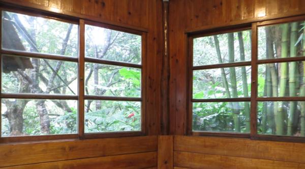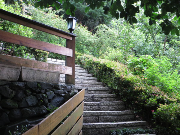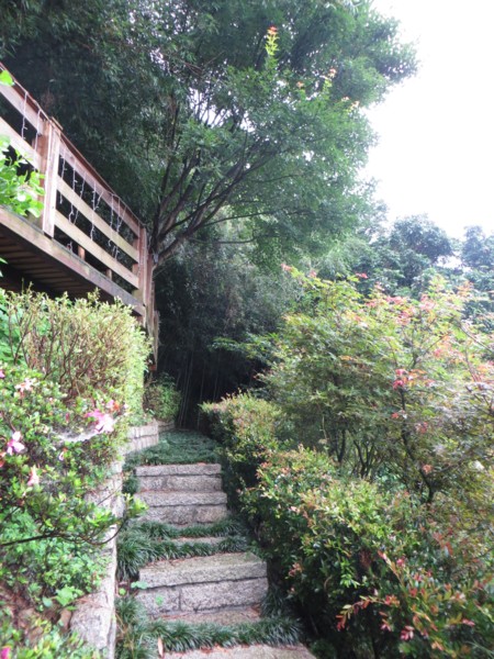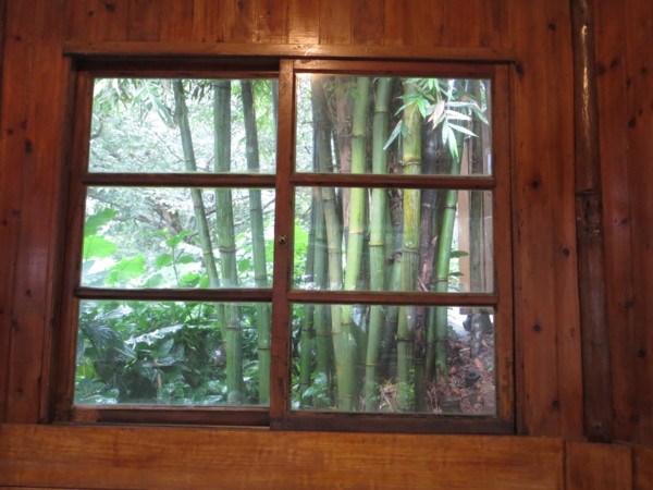 凌雲禪寺下方即開山凌雲寺正前方有一免費停車場,沿停車場左側拾級而下,石階兩側樹木扶疏,密不透光,靜謐無聲,僅聞鳥鳴,沿石階行,未及百階,驚見山莊內食客滿座,堂倌趨前引座,進一木造小屋,三面大玻璃窗,落座滿茶,三面大玻璃窗外樹木參天,綠意盎然,似無裏外之分,桃花心木與竹林新芽初冒,一抺新綠倒映在茶杯水面,倒影在茶杯水面晃動得煞是好看,一抺新綠一飲而盡。