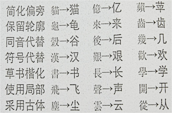 6、簡化偏旁:同音相借,大失原意,如億→亿、蘋→苹。