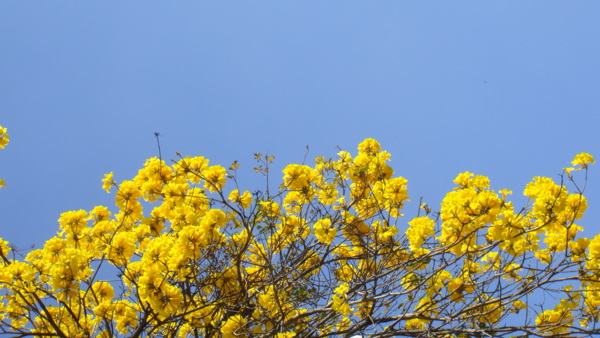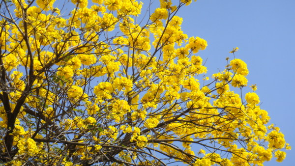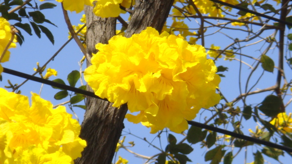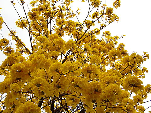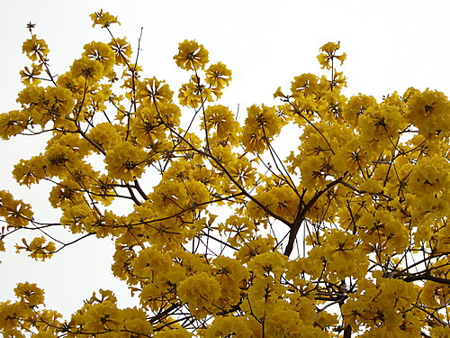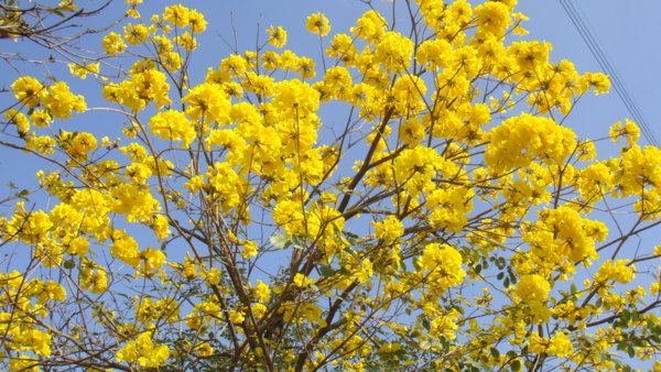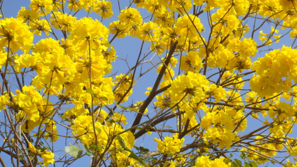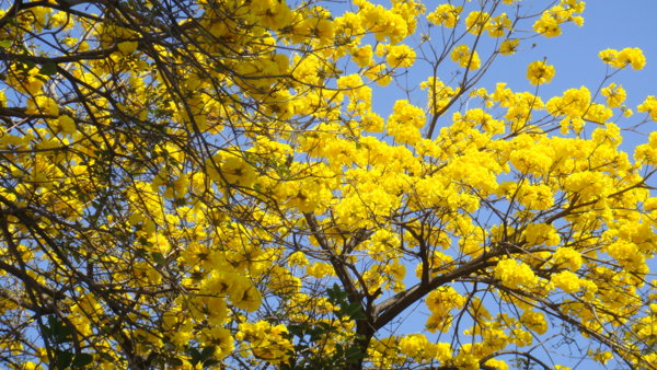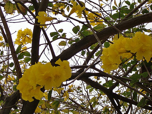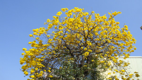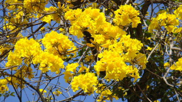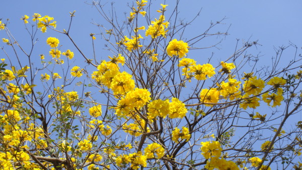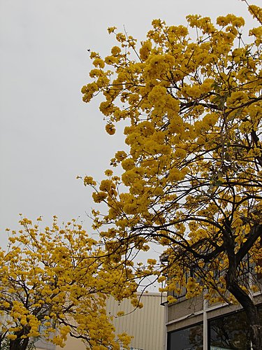 「黃花風鈴木」,紫葳科 (Bignoniaceae)風鈴木屬(Tabebuia)。原產地:墨西哥至委內瑞拉,台灣於 1969 年引進種植多栽植於庭園以供觀賞,近年來台灣中南部有些路段栽植為行道樹。據說嘉義市世賢路、自由路,台中縣后里鄉三豐路也有種植。黃花風鈴木,落葉喬木,又名「伊貝樹」,為巴西國花,是一種會隨著 4 季變化而更換風貌的樹,樹高 4~6 公尺最適合觀賞,樹皮有深刻裂紋(紅花風鈴木-樹皮光滑),掌狀複葉,小葉 5 枚,倒卵形,先端尖,全緣或疏齒緣,全葉被上褐色細茸毛。花冠漏斗形,也像風鈴狀,花緣皺曲,但為兩側對稱花,花色鮮黃。果為長條狀翅果,二裂,18~30 公分,種子具翅。黃金風鈴木,四季各有不同風味,春天約 3月開花,花季時花多葉少,頗為美麗。