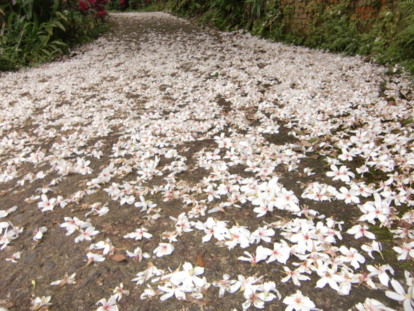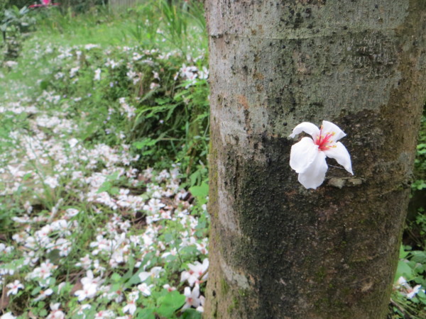 一陣輕風徐來,桐花像雪片飄下,落英繽紛,仔細注意桐花掉落,原來是以極優雅類似唐朝西域「胡旋舞」一般,旋轉而下,在讚嘆之餘,不免為飄落的桐花傷感,龔自珍的詩:「落紅不是無情物,化作污泥更護樹。」,或可稍稍平復遊人的感傷,相約明年此時再見。