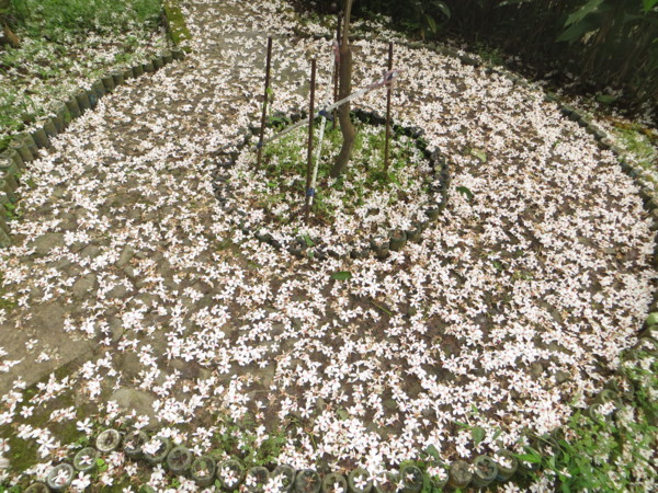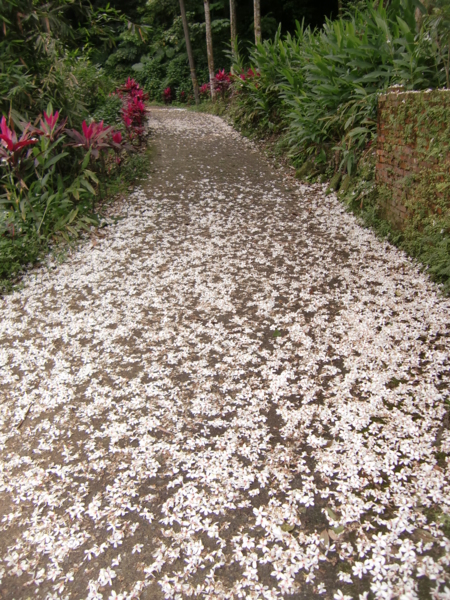 就在藍鵲家族棲息的桐花林旁,一條比產業道路還窄,約寛三公尺的水泥路通往一戶私宅,路口灑滿新鮮欲滴的桐花,依勢而上,整條路舖滿白雪般的桐花,真箇「花徑不曾緣客掃」,未見一個訪客腳印足跡,輕踏在像似印滿桐花的絲絨綢緞前進;小徑邊但見一間土地公廟,客家人稱「伯公」,廟旁有一四十多坪大小的秘境花園,花園裏以紅磚排列圓環通道通向四方,秘境花園上方被密不見天的桐花林完全覆蓋,秘境花園也被不停飄落的桐花嚴嚴實實地舖滿一地,猶如身在仙境,所謂:「一花一世界,一葉一如來,一笑一塵緣,一念一清靜。」,太奢侈!真美,美極了,美的令人摒住氣息。