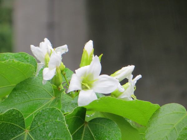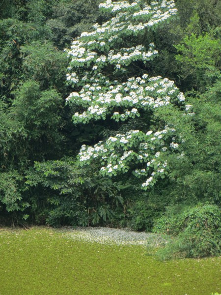 離開喧囂車多人也多的基隆市區,仁一路剛轉月眉路,即感覺放眼所見已是青山綠林,沿山尋找桐花,車行二十多分鐘就快要到達<靈泉禪寺>了,卻未見五月雪般的桐花林,甚至連稀疏的三兩棵桐花也未見矗立山顛或路旁。沒想到就在到達<靈泉禪寺>的最後一個彎路,滿坑滿谷的桐花恣意怒放,青山綠林變成白雪皚皚,難怪台灣山區早年艱辛而勤奮的客家人,始終那麼愛戀著桐花,「天道酬勤」,上天回饋給山區的客家人,桐花是每年四、五月的獻禮。
