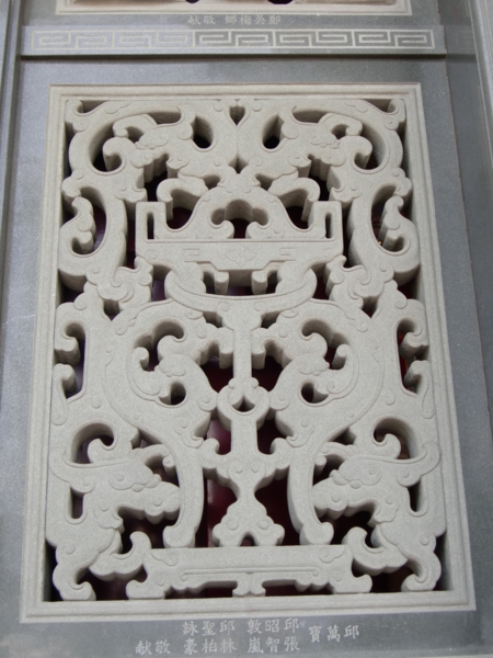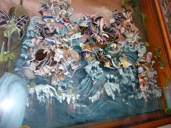 這幅是剪黏作品,即先塑形,再以交趾陶碎片剪下適當大小、顏色黏貼,又名為剪花,緣起乃因交趾陶昂貴易碎,以剪黏代替,日久成習,變成一種獨特不同於交趾陶的寺廟藝術,也常見寺廟的屋簷作品,非常值得細細觀賞,令人歎為觀止。