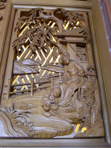 這些木雕都是台灣檜木,保持檜木的原色,檜木香氣令人神清氣爽,站在本土師父的木雕作品前,屏氣凝神,立即被雕刻作品所感動,你可以感覺到作品原創藝術家要傳達的美學藝術與教忠教孝的故事,你不用搭機千里迢迢在中東、中亞看清真寺,不用再三轉機在君士坦丁堡看東正教教堂,或到印度泰姬瑪哈陵、吳哥窟,一樣可以有宗教情懷的深度感動,儒釋道最高層次最精緻的藝術與教義,中國的寺廟藝術家始終未受到應有的尊敬,他們內心有菩薩的莊嚴,道家神明的清明,儒家的仁義,始能在雕刻裏傳達儒釋道的真義與境界,他們不是工匠,是藝術家,是儒者與修行者。
