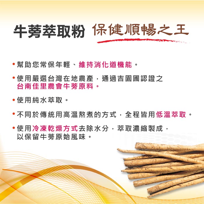 - 愛之味生技隆重推薦順暢保健精粹配方 添加低溫萃取濃縮牛蒡精華