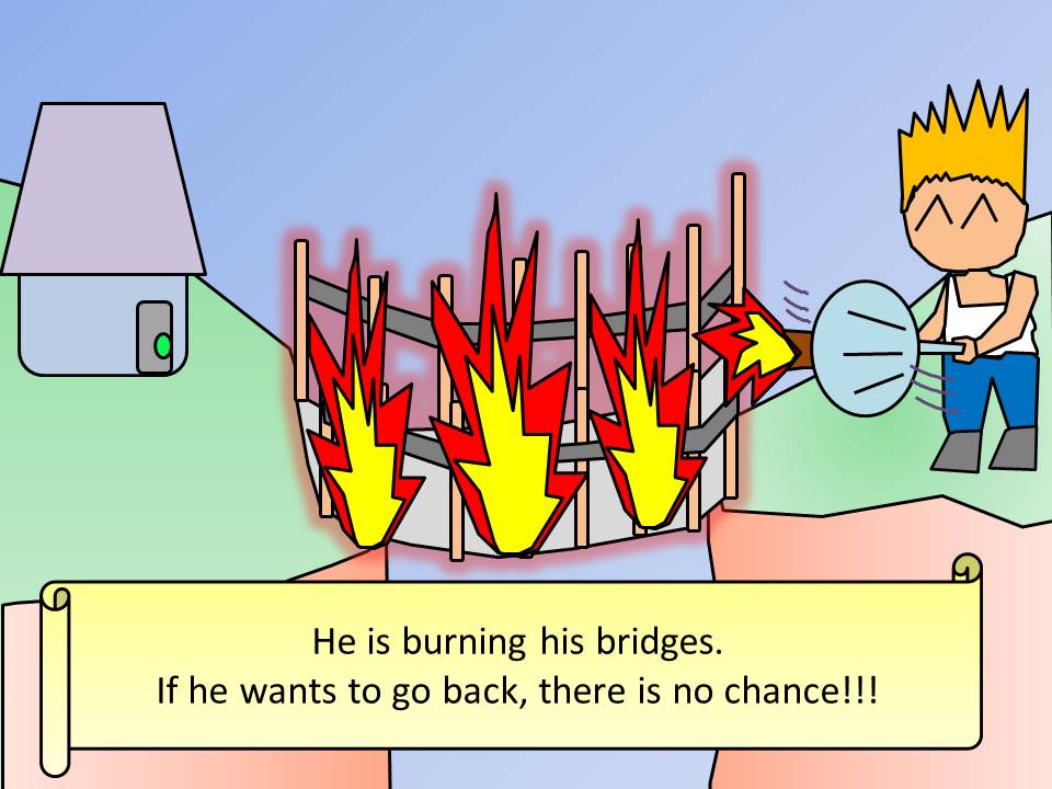 "Burn one’s bridges" 的意思是以無理的、甚至不符合道德標準的方式斷除所有回到原先位置的可能。舉一個最常見的例子,當一個員工離職以前,他發出電子郵件給所有的在職員工抱怨公司以及情緒上的字眼來辱罵公司,似一台失控的大砲。如果他後來又想回到原公司上班,那絕對是不可能的事情。我們可以總結他的行為"bridge burning."