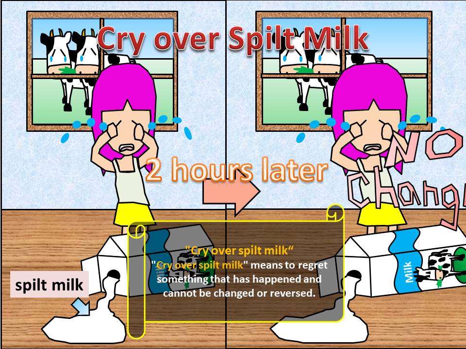 "Cry over spilt milk" 的意思是對一些已發生的事情非常後悔,但是這些事情都已發生,是沒辦法被改變的事實,無法從頭開始了。 一夜之間,你在股票市場的存款化整為零時,crying over spilt milk是沒有用的。這表示說你的錢不會回來,儘管你哭的再厲害都沒有用了。