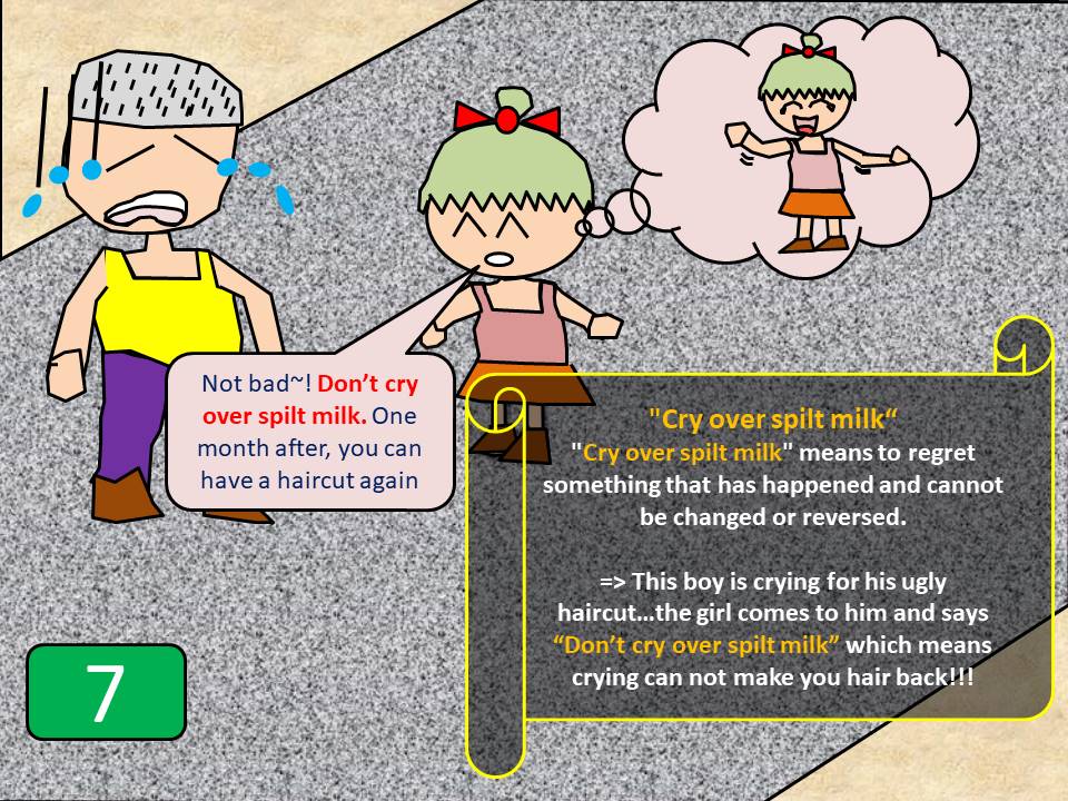 2. I know you do not like your haircut but you cannot change it now. It’s no use crying over spilt milk.